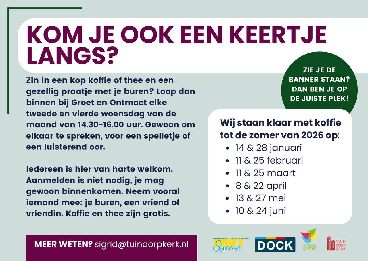 Zin in een kop koffie of thee en een gezellig praatje met je buren? Loop dan binnen bij Groet en Ontmoet elke tweede en vierde woensdag van de maand. Gewoon om elkaar te spreken, voor een spelletje of een luisterend oor.